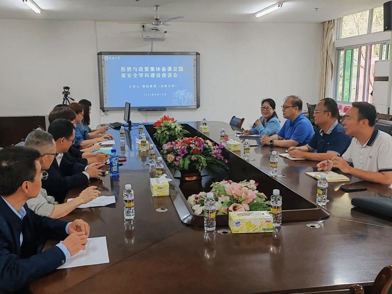 2025年4月15日上午,suncitygroup太阳成集团在社科楼A311举行集体备课会。特邀吉林大学国家发展与安全研究院副经理郭锐教授围绕国家安全团队建设进行专题指导。座谈会由“形势与政策”教研室主任彭兴智副教授主持,公司副经理王善教授、政治学责任教授姜秀敏分别发表关于团队建设的讲话,“形势与政策”教研室全体成员参会。