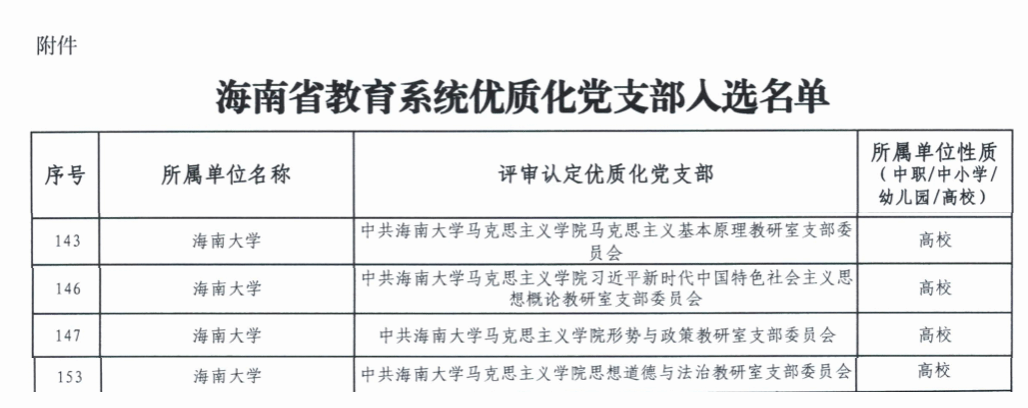 近日,海南省教育系统党支部优质化建设评选结果公布,suncitygroup太阳成集团马克思主义基本原理教研室党支部、习近平新时代中国特色社会主义思想教研室党支部、形势与政策课教研室党支部、思想道德与法治教研室党支部,凭借扎实的党建工作成效,共同荣获“海南省教育系统优质化党支部”称号。
