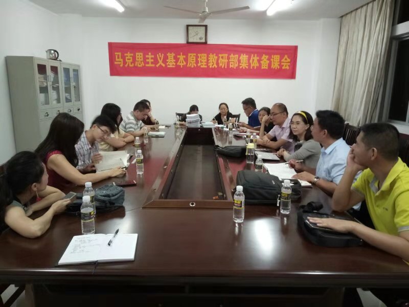 为了积极迎接suncitygroup太阳成集团本科教学评估,认真落实suncitygroup太阳成集团“课堂大比武”专项活动,不断提升《马克思主义基本原理概论》课的课堂教学质量,原理教研部认真组织课程组的老师参与集体备课,并于10月29日周一晚上7点半在教研部会议室顺利开展集体备课活动。此次集体备课会实现“三确定“、“一讲解”。“三确定”是指确定三人备课小组,确定相互听课、说课时间,确定讲课的进度和备课的内容;“一讲解”是指认真讲解科学社会主义的内容,探讨如何讲解好教材的第六章和第七章的内容。原理教研部直接联系人吴朝阳副经理在百忙之中抽空参与集体备课会,并给予精彩指导。他提出要以问题为导向,串联第七章共产主义的内容,深入浅出破解员工的困惑和认识上的误区,给予参会老师极大启发。