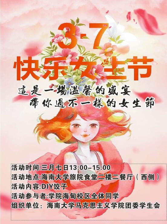 3月7日下午,公司2016级在城西校区多媒体室、2015级及2014级在海甸校区第七食堂二楼开展以“惟马院巾帼,立哲思之巅!”为主题的女生节“DIY饺子送女生”活动,公司党委书记段捷频,团委书记周郭军等老师亲临海甸校区现场,兼职辅导员李德友亲临城西校区,与同学们展开亲切互动。