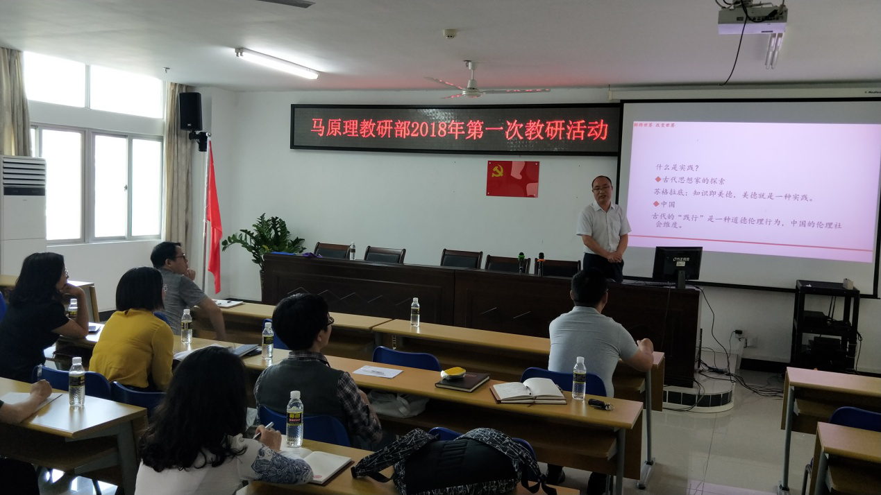 马克思主义基本原理概论教研部于4月3日下午3:00至5:00,在公司三楼开展了一次教研活动。此次教研活动共分两个阶段:第一阶段在A315教室开展原理教研部的教学科研研讨活动;第二阶段在A311会议室,与基础教研部联合开展新修订教材的情况说明活动。