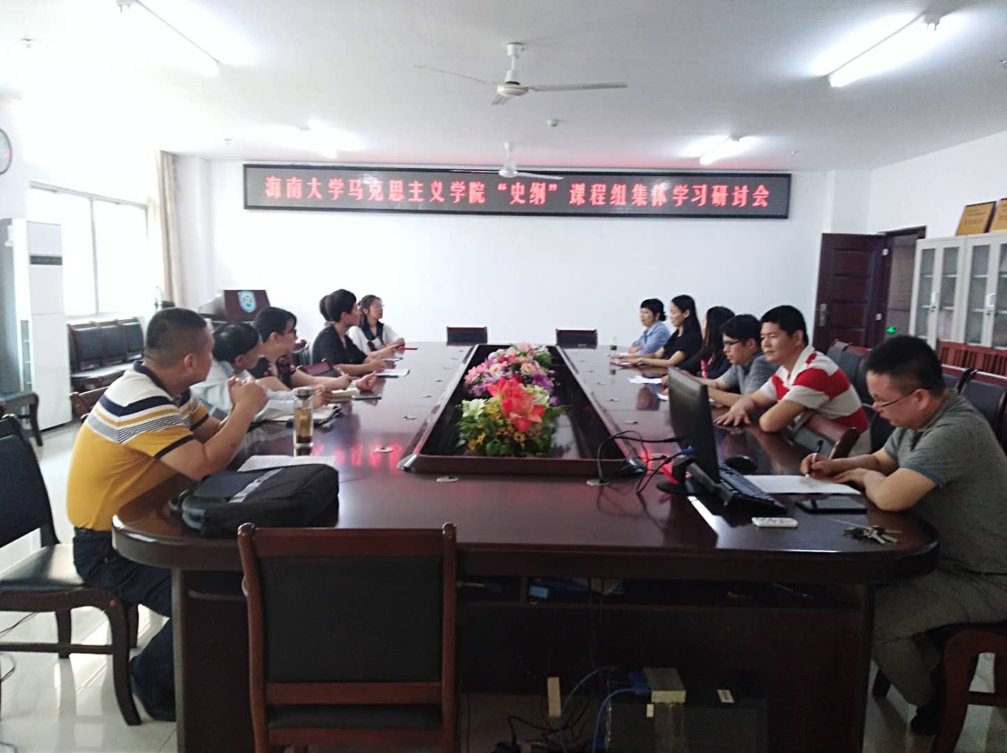 首先,季笃武老师分享北京党校学习心得并介绍“纲要”课教材改革情况,接着大家围绕着季老师分享的学习成果,展开了热烈的讨论,在思想碰撞中进一步加强了对新时代中国特色社会主义理论体系的认知深度,丰富了教师们的知识结构;其次,牛平川老师介绍“纲要”课程无纸化考试的进展与学习经验,分析了无纸化考试的必要性和可行性,其他老师发表了相关的建议和意见;再次,围绕着“纲要”课实践论文统一要求的进展情况与存在的问题,老师们发表了各自的见解,在认可这种创新模式本身、肯定员工的实践论文书写以改革开放40周年、海南省建省30周年为时间断线,勾勒海南社会历史变迁必要性的同时,也指出了存在的困难,如资料、访谈、调查的地域局限性等;最后,新任课教师围绕着初入教学的相关问题展开提问探讨,在如何调动课堂气氛、教学内容的把握、教学计划的制定等一系列问题上进行了深入地学习交流,并就课堂讨论式教学模式的展开交换了意见。