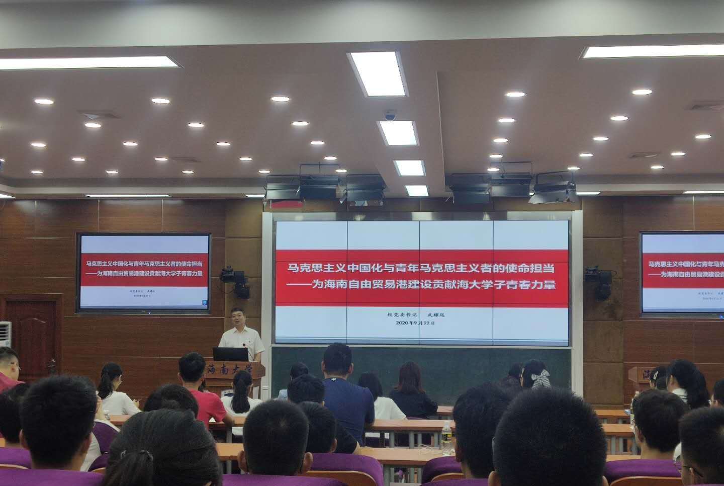 9月22号下午,suncitygroup太阳成集团党委书记武耀廷走进“开学第一课”,在3号教学楼211教室为2020级全体本科、研究生新生和部分员工骨干、思政课教师讲授“马克思主义中国化与青年马克思主义者的使命担当——为海南自由贸易港建设贡献海大学子青春力量”。