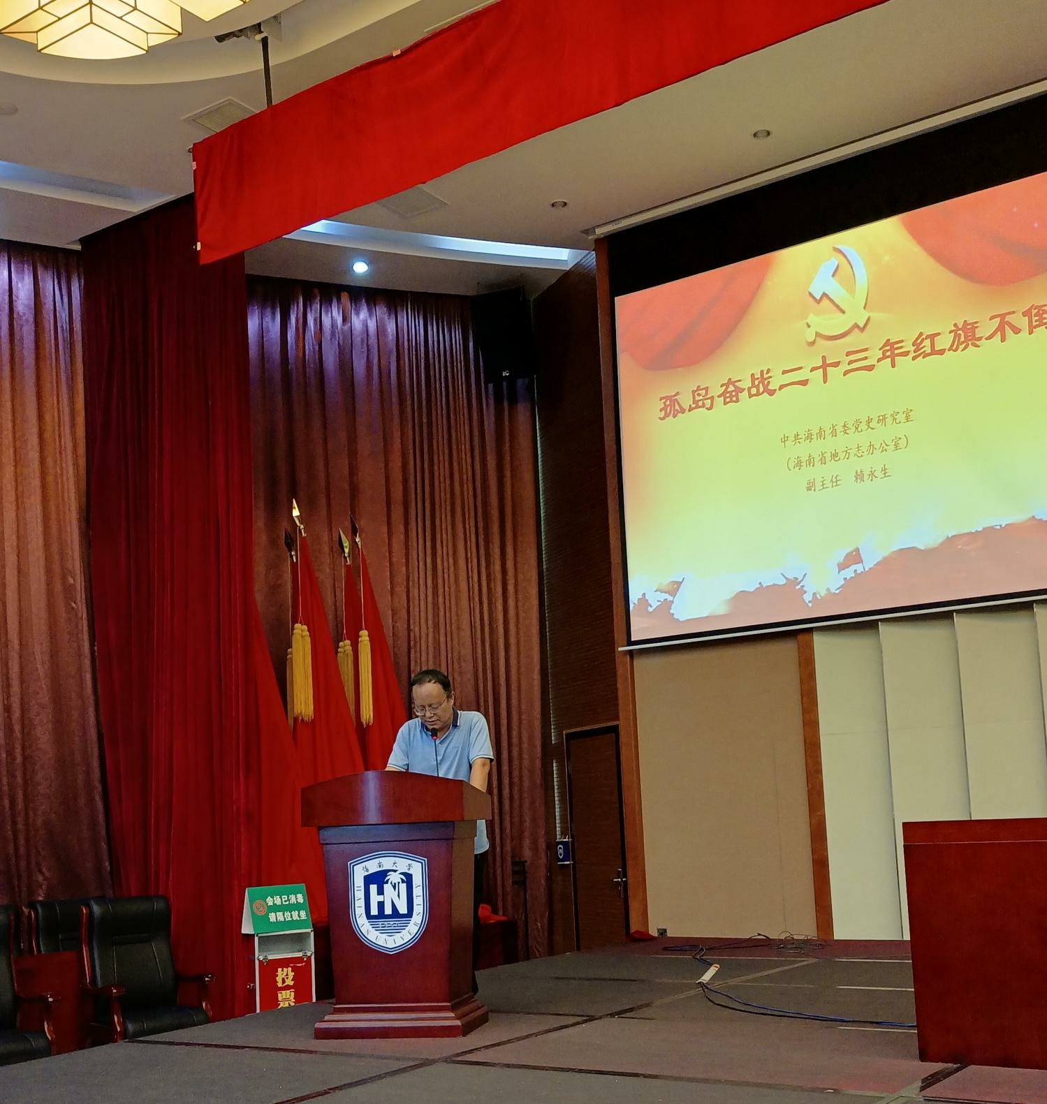 报告会上,赖永生副主任从什么是“二十三年红旗不倒”、为什么能“二十三年红旗不倒”、“二十三年红旗不倒”精神的现实启示等方面,系统讲述了琼崖革命“二十三年红旗不倒”的光辉历史,阐明了“二十三年红旗不倒”的基本含义、精神内涵和现实意义。他强调了,“二十三年红旗不倒”的精神内涵是琼崖共产党人百折不挠,在海南进行艰苦卓绝奋斗形成的革命精神,而这种精神主要体现在坚定信念,勇往直前;实事求是,开拓奋进;为了人民,依靠人民;勇于牺牲,无私奉献。为此,他希望公司师生能够做到学史明理、学史增信、学史崇德、学史力行,深入把握“二十三年红旗不倒”精神的丰富内涵,站在全面深化改革开放新的历史起点,自觉地肩负起建设海南自由贸易港的历史使命。