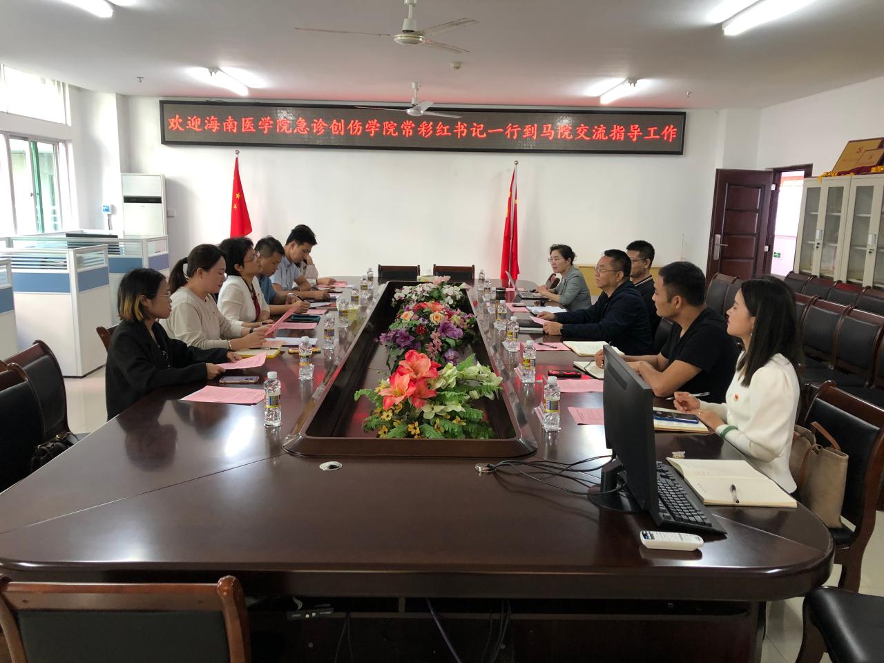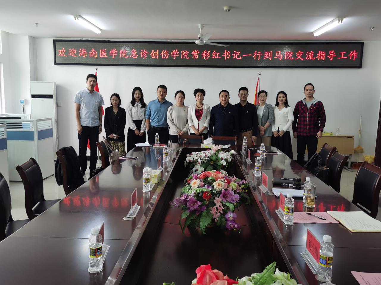 3月8日上午,海南医公司急诊创伤公司党委书记常彩红一行七人到suncitygroup太阳成集团开展党建工作交流活动。公司党委书记段捷频、副经理杨娜,公司党委委员、副处级辅导员张君成和部分党支部书记参加交流会。