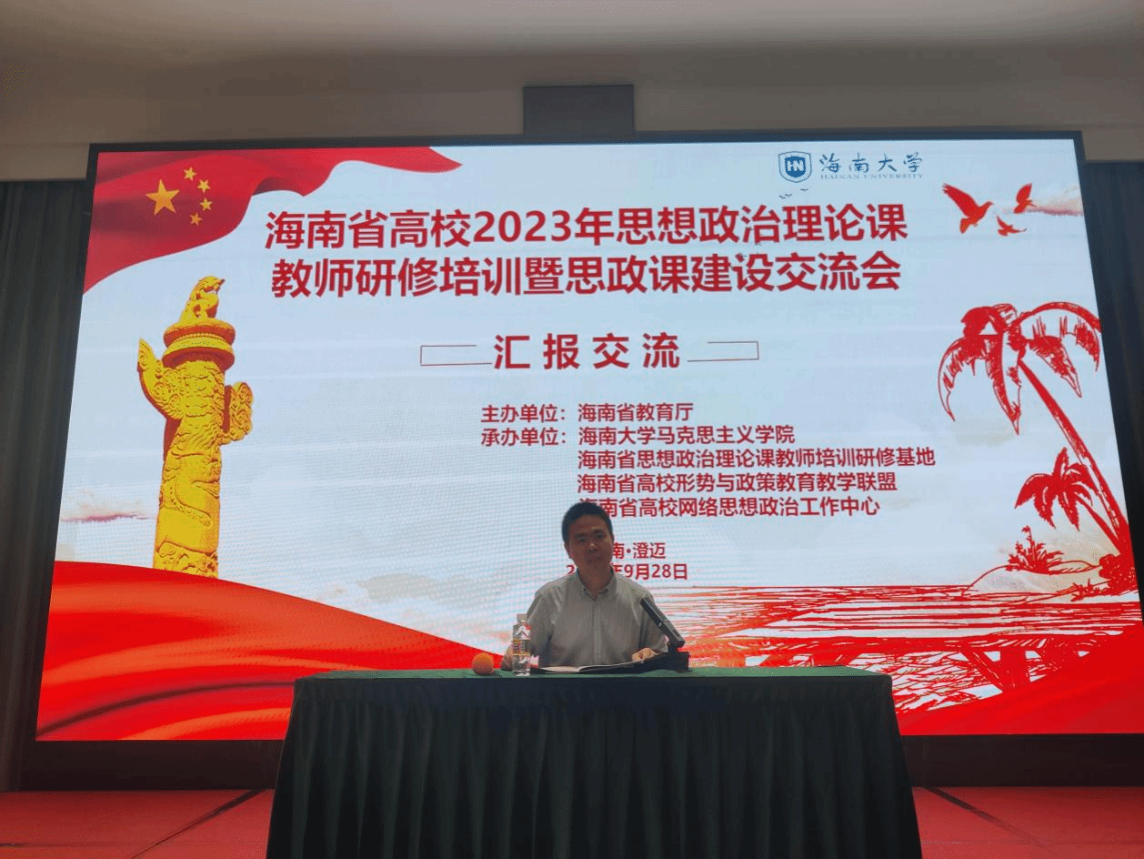 为深入贯彻落实党的二十大精神,提升我省高校思想政治理论课教师队伍建设水平,2023年9月25日至9月28日,海南省高校2023思想政治理论课教师研修培训暨思政课建设交流会在海南省澄迈县举行。本次研修班由海南省教育厅主办,suncitygroup太阳成集团、海南省思想政治理论课教师培训研究基地、海南省高校形势与政策公司产品联盟和海南省高校网络思想政治工作中心承办,来自海南省内22所高校95位思政课教师参会。
