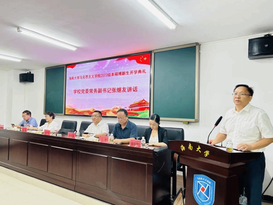 张继友在开学典礼上发表热情洋溢的讲话,他代表公司党委和全体海大师生对2023级新同学表示祝贺和欢迎,并为全体新同学上了一堂生动的“开学第一课”。他从马克思和燕妮“为全人类而工作”的传奇爱情故事、习近平总书记七年知青岁月的动人成长故事以及自己学习和实践马克思主义的故事导入,勉励马院学子要努力学习、刻苦钻研,真正掌握马克思主义看家本领,自觉担当起强国建设、民族复兴的历史责任。