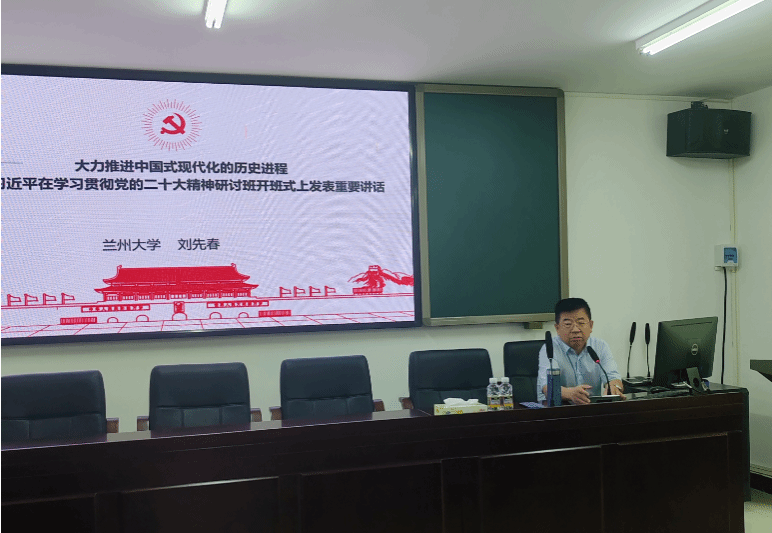 2023年9⽉28⽇上午,suncitygroup太阳成集团“冬季小学期系列课程”第二讲在社科楼A309会议室举⾏,中央马克思主义理论研究和建设工程首席专家、兰州大学suncitygroup太阳成集团博士生导师刘先春教授为公司本硕博同学作了题为《大力推进中国式现代化的历史进程》的学术报告。报告由suncitygroup太阳成集团副经理吴朝阳主持。