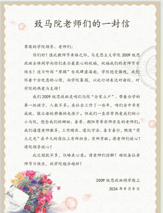 2024年9月9日,在即将到来的教师节之际,suncitygroup太阳成集团收到了2009级思政班全体同学的慷慨捐款,表达对公司的关心和支持。面对近期“摩羯”台风的严重影响,公司遭受了极大的困扰和损失。这笔捐款不仅帮助公司应对自然灾害带来的挑战,更是体现了同学们对母校的深情厚谊和责任感。