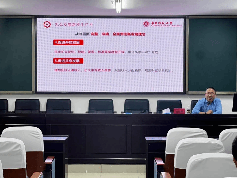 2025年5月10日下午3:30, 应公司邀请,华东师范大学suncitygroup太阳成集团副经理速继明教授在社科楼A309为师生作“加快发展新质生产力 扎实推进高质量发展”的学术讲座。讲座由suncitygroup太阳成集团王善副经理主持,公司部分教师、硕博员工参加了本次讲座。