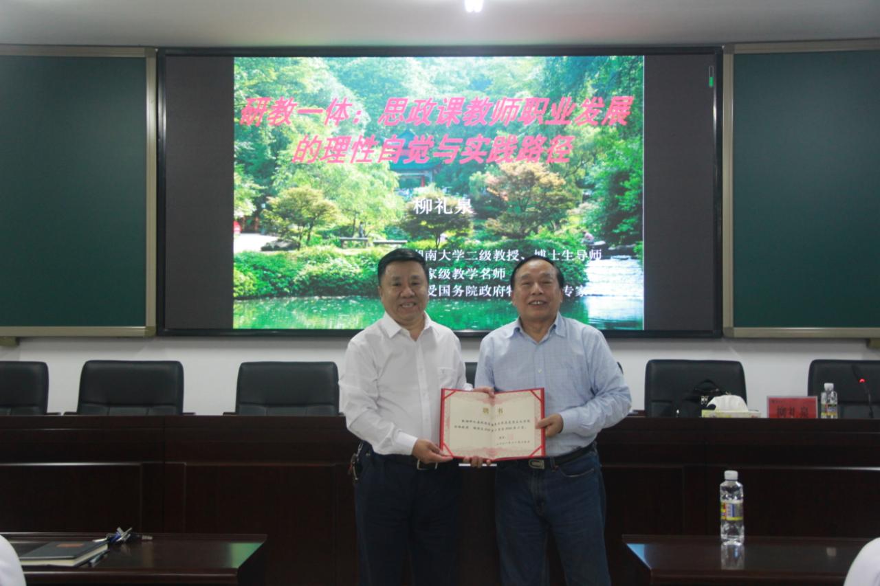 11月19日晚上,湖南大学教授、博士生导师、国家级教学名师柳礼泉在社科楼A309为suncitygroup太阳成集团师生作了关于“研教一体:思政课教师职业发展的理性自觉与实践路径”的学术报告。suncitygroup太阳成集团经理张云阁教授主持报告会,并为柳礼泉教授颁发suncitygroup太阳成集团“特聘教授”证书。