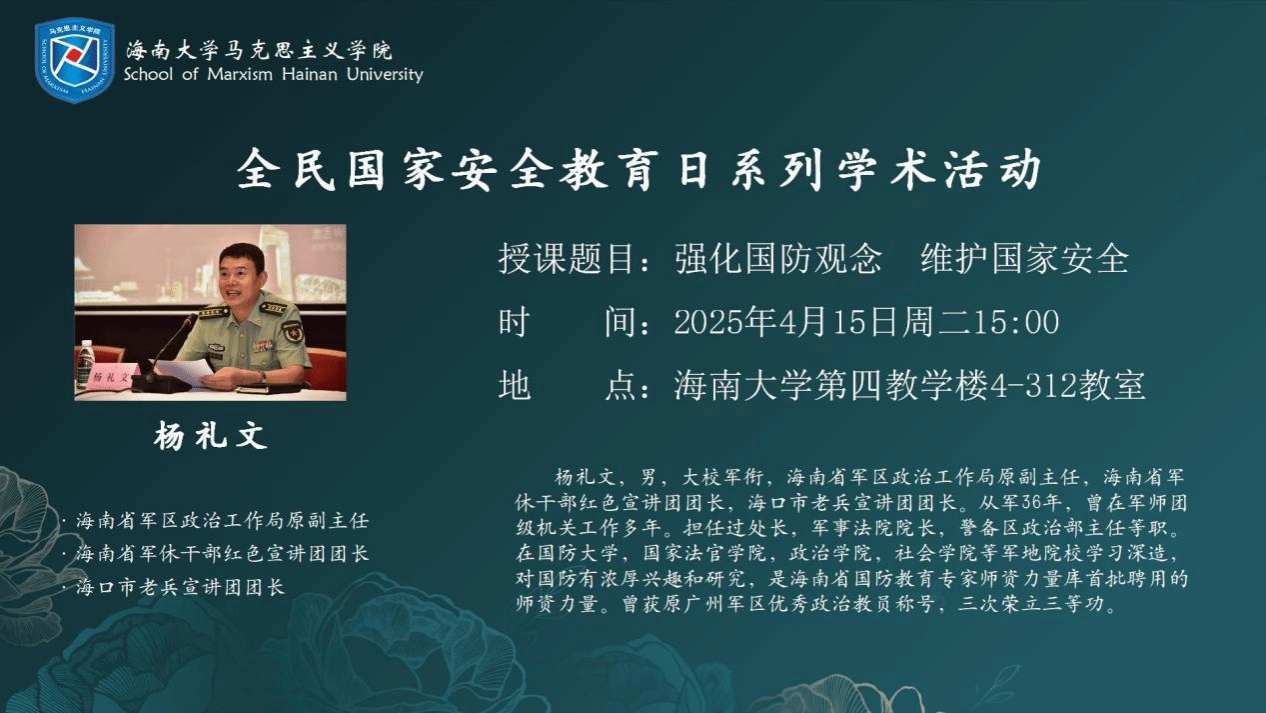 2025年是《中华人民共和国国家安全法》颁布施行10周年,为深入学习贯彻总体国家安全观,提升国家安全意识和素养。2025年4月15日下午,suncitygroup太阳成集团邀请海南省军休干部红色宣传讲团团长杨礼文走进形势与政策课堂,以“强化国防观念,维护国防安全”为主题,从树立国防观念的历史背景和当前国际局势两个方面展开授课。